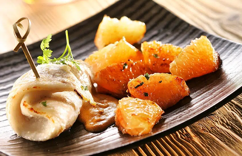 Rol de visfilets op en bevestig met een houten spies. Leg in een ovenschotel en besprenkel met pompelmoessap. Kruid met peper en zout en strooi er schelpjes boter over.