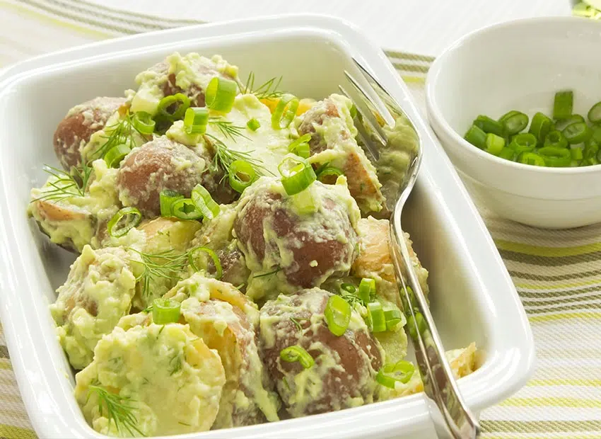 Vermeng de mayonaise, de wasabi en de sojasaus in een kom. Doe er de aardappelen, de avocado’s, de eieren, de selderij en de uien bij.