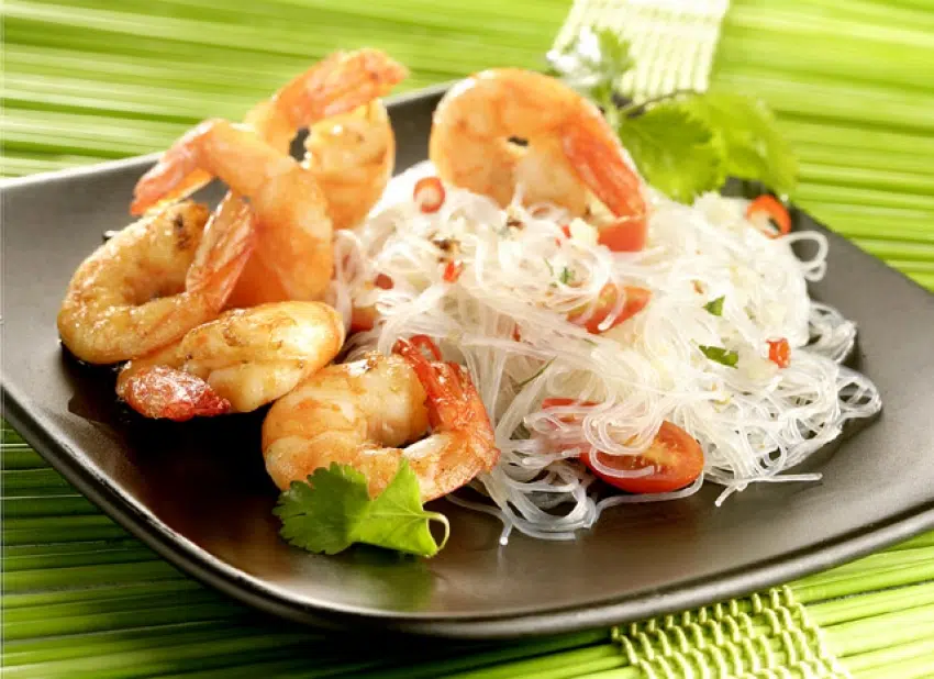 Serveer elk bord apart met de koude vermicelli en de warme garnalen.