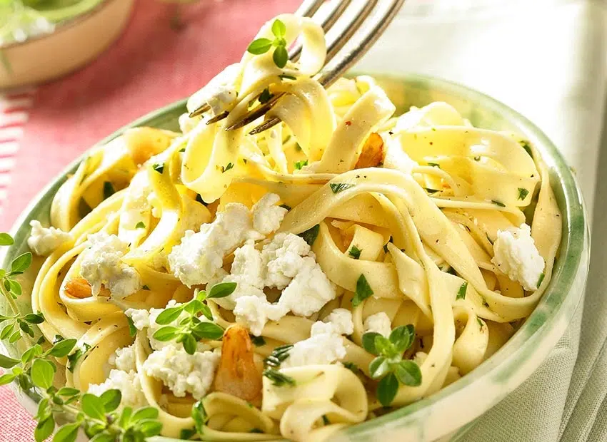 Pel de teentjes knoflook, verwijder de kiem, snij fijn en fruit in 2 el olijfolie in een grote pan. Doe er de goed uitgelekte tagliatelle en de gemarineerde kruiden bij. Verwarm op een zacht vuur en meng goed.