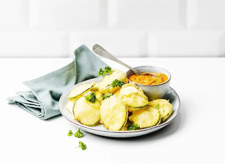 Dompel de courgetteschijfjes in het beignetdeeg en stop 5 minuten in de friteuse op 160°C.