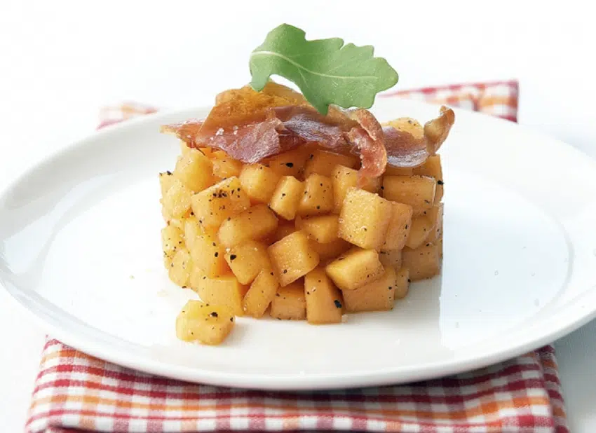 Maak met behulp van een uitsteekring torentjes meloentartaar. Garneer met de rauwe ham en de notensla.