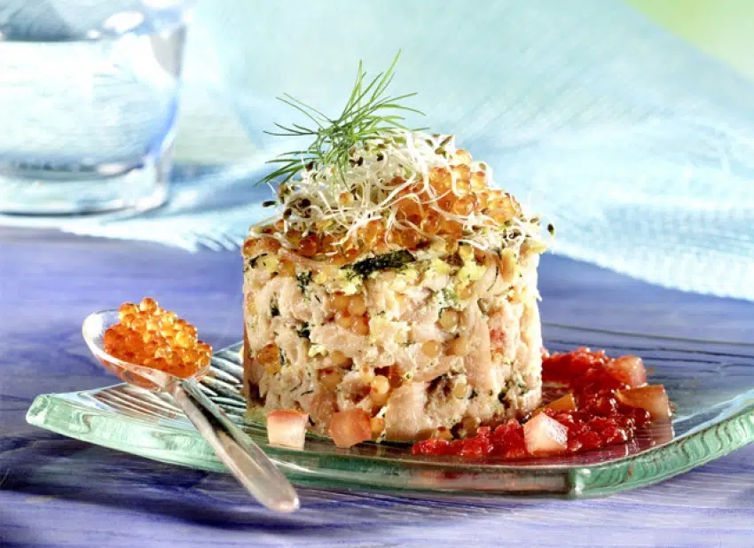 - 400 g forelfilet2 eieren Moisson10 cl melk Pâturages3 tomaten2 el olijfolie van Bouton d'Or20 g boter Pâturages20 cl verse room Pâturages100 g kruim van oud brood100 g foreleitjes Capitaine Cook2 el dragon Cigalou2 el gehakte dille1 sap van 1 citroen1 tl suiker1 bakje alfalfa (gekiemde luzernezaadjes)