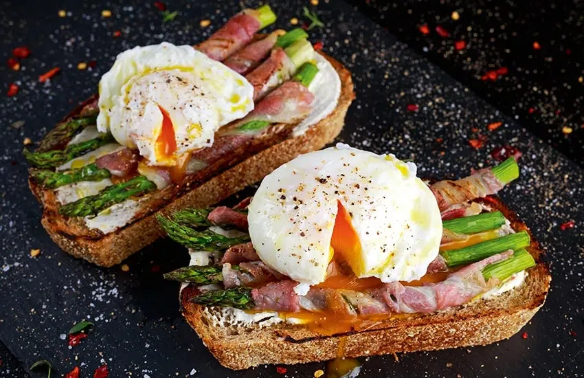 Besmeer elk sneetje brood met verse kaas en leg er de bacon-aspergerolletjes en het gepocheerde ei (zonder huishoudfolie) op. Kruid met peper, zout en een snufje Espelettepeper.