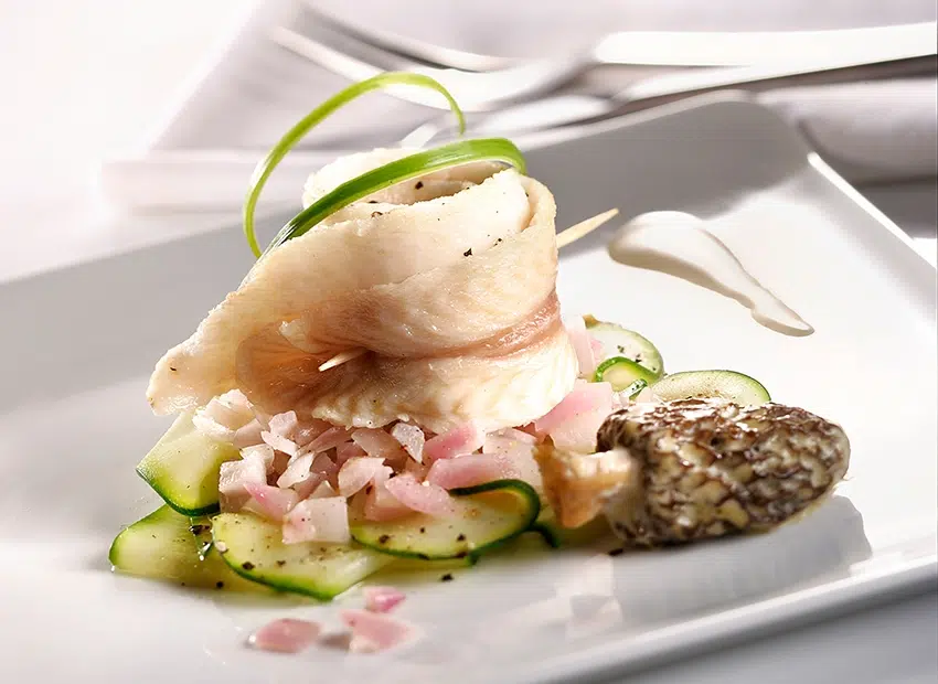 Schep de courgettes op borden, doe er de sjalotten en dan de tongfilet bij en werk af met de romige morieljes.