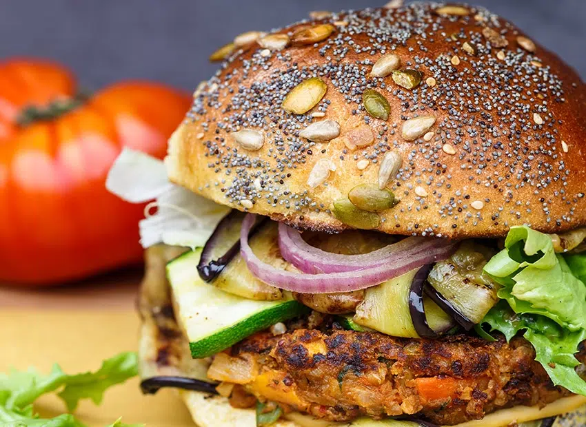 Rooster de courgetteplakjes (ingestreken met wat olie), de vegetarische hamburgers en de broodjes op de barbecue.