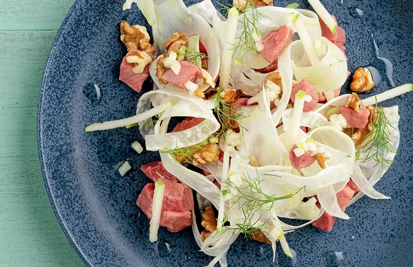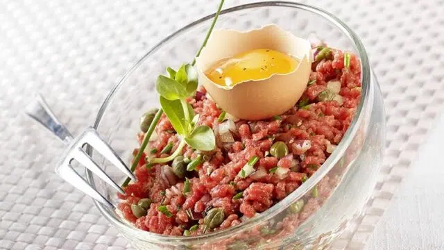 Maak een tartaar van runderlende. Kruid met zout, peper, olijfolieen het sap van 1/2 citroen.