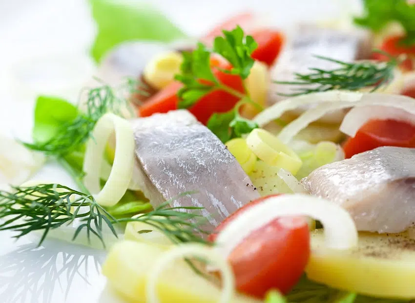 5. Doe er de sla, tomaten, uien, dille, versnipperde peterselie en maatjes bij. Hussel door elkaar en serveer koud.