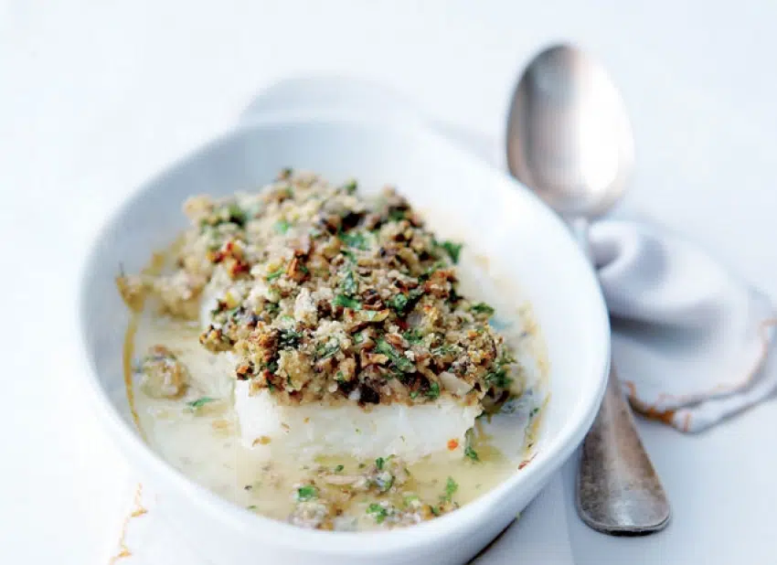 Visfilet met witbier en crumble van champignons