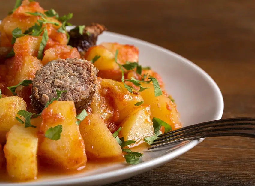 Snij de worst in dikke schijven en voeg ze samen met het kookvocht toe aan de zoete aardappelen. Bak nog een tiental minuten.
