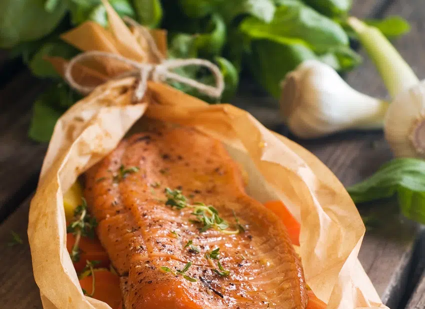 Leg op elk vel bakpapier een zalmfilet, enkele looktenen, twee basilicumblaadjes en een takje tijm. Kruid met peper en zout en overgiet alles met een straaltje olijfolie.