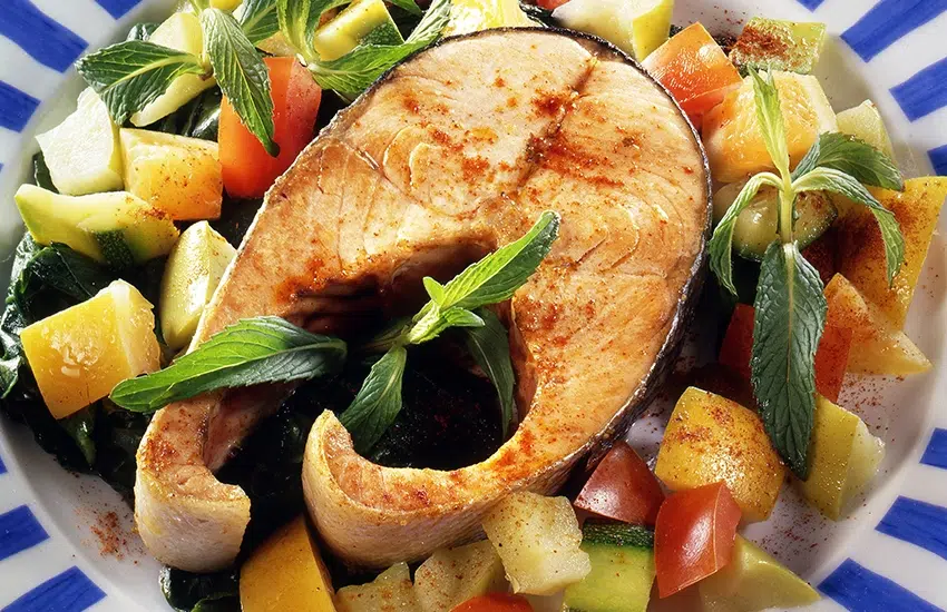Zalmsteaks, gebakken groenten met munt