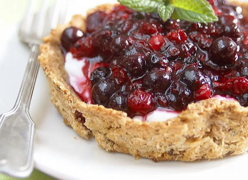 Zandtaartjes met kersen en rode bessen