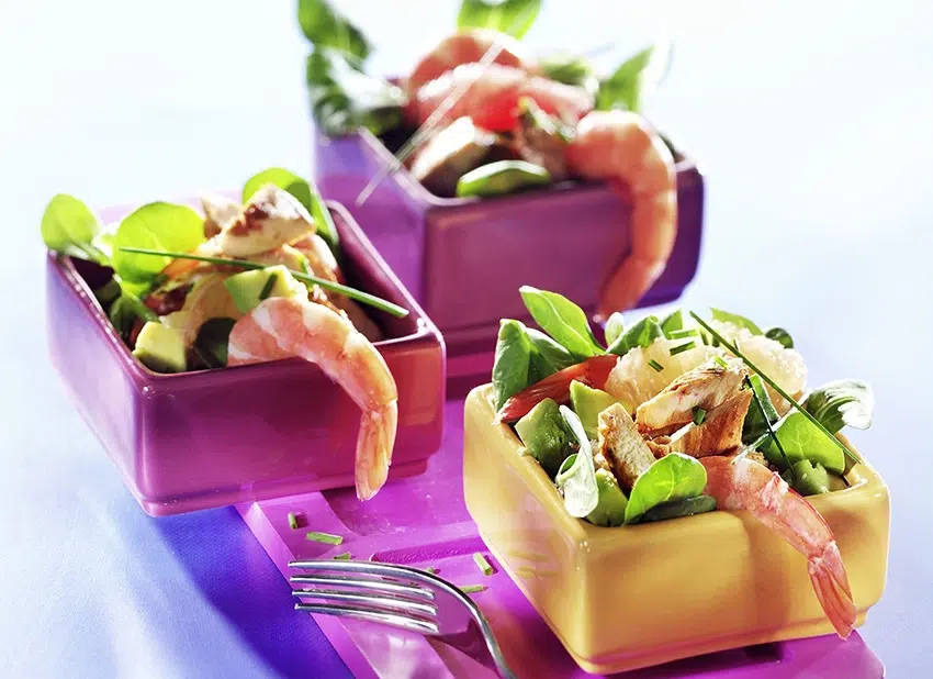 Meng de veldsla, de pompelmoes, de avocado, het bieslook, 2 eetlepels olijfolie en kruid met peper en zout. Dresseer de salade op de borden en leg de kip en de scampi’s erbovenop..