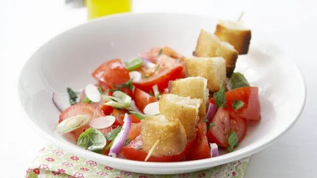 Salade van panzanella met spiesjes gegrild brood