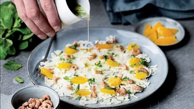 Bloemkoolcarpaccio met citrusvinaigrette en grijze garnalen