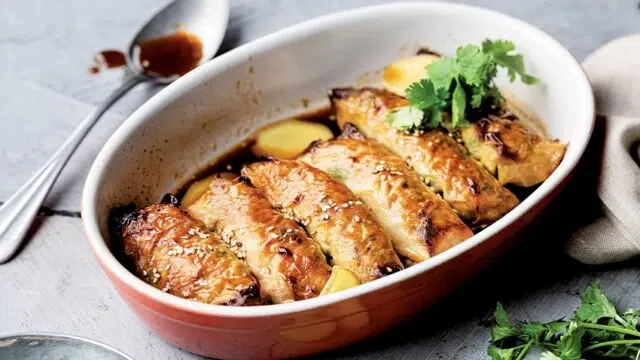 Nems met kool en gelakt varkensvlees