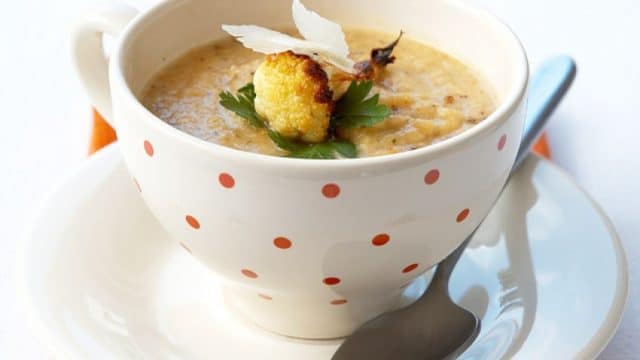 Velouté van geroosterde bloemkool, Parmezaanse krullen