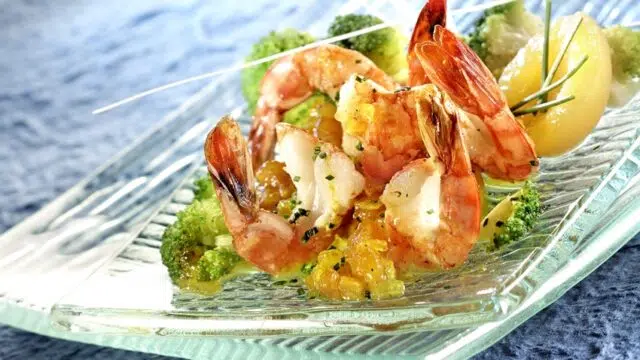 Gambas grillées, verdure de brocolis et chutney de mangue