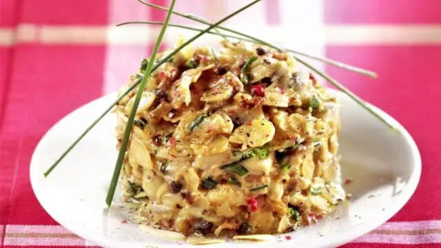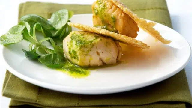 Millefeuille de Saint-Jacques sur lit de salade de blé à l’huile verte