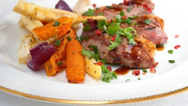 Filets de canard grillé, vinaigrette tiède au vinaigre balsamique et à la coriandre