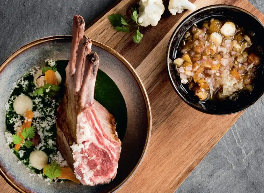 Pour le dressage, couper le carré d’agneau en 4. Prendre des assiettes creuses. Napper le fond des assiettes avec le jus vert de cerfeuil, y déposer le carré d’agneau. Faire quelques points de crème de chou fleur sur la viande et arroser le plat avec la vinaigrette aux fruits secs et au chou fleur.