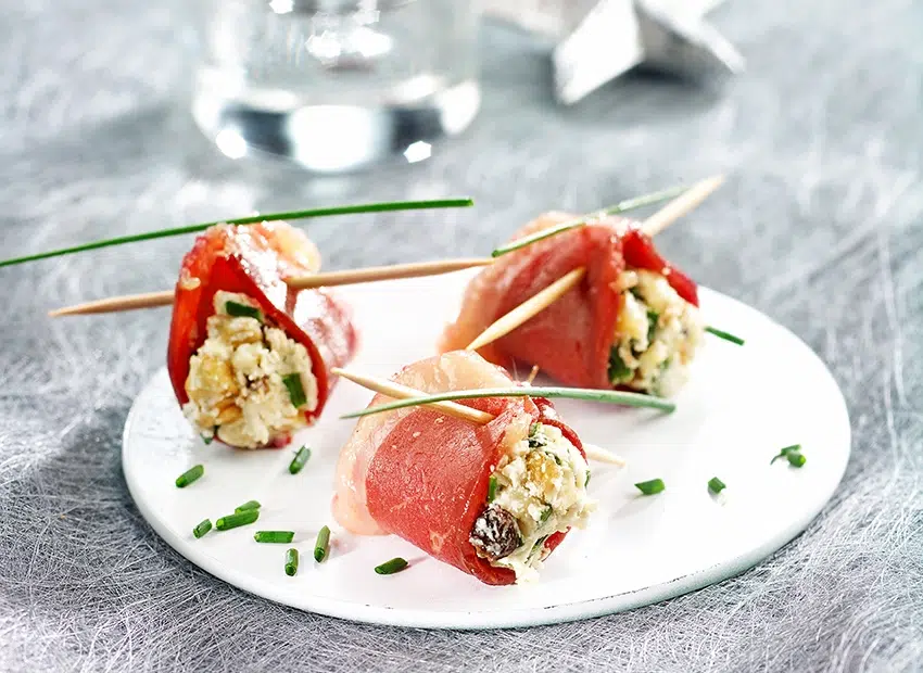 2. Déposez cette préparation au centre de chaque tranche de magret, roulez et faites tenir par une pique en bois.