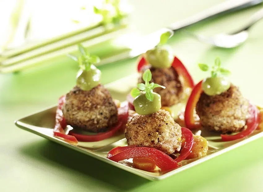 Pour dresser, entourez chaque boulettes de légumes et piquez-y une olive sur un cure-dent des petites feuilles de basilic.