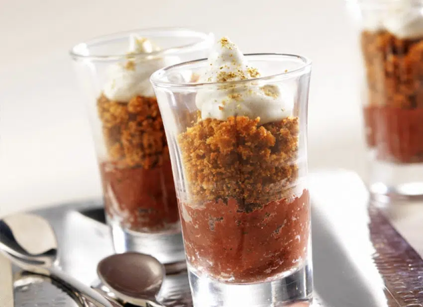 Déposez une couche de boudin puis une couche de pain d’épices dans les verrines. Filmez et réservez au frais.