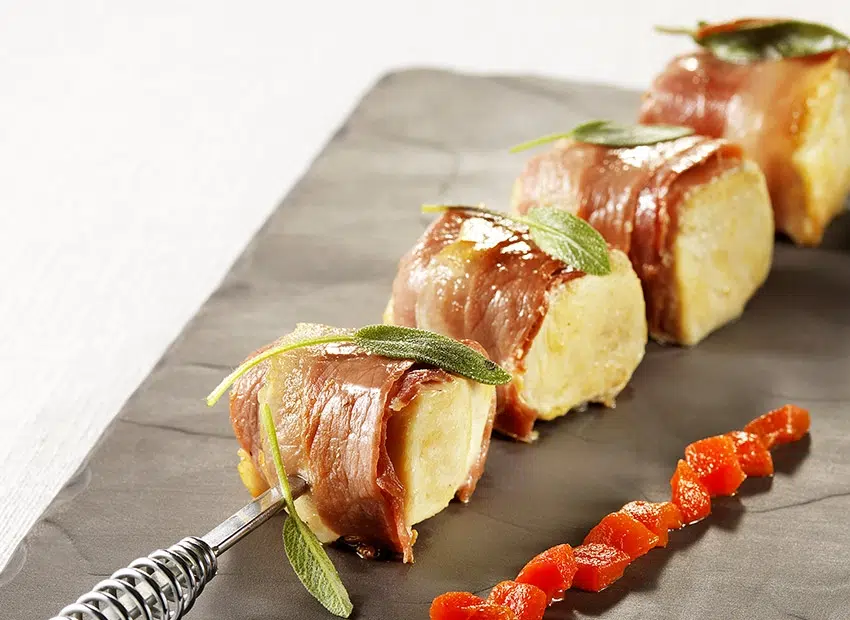 3. Découpez le poulet en morceaux (salez peu et poivrez) et les tranches de jambon en 2 dans le sens de la longueur. Roulez chaque morceau de poulet dans une lanière de jambon en glissant une feuille de sauge au milieu, puis enfilez sur des piques en métal