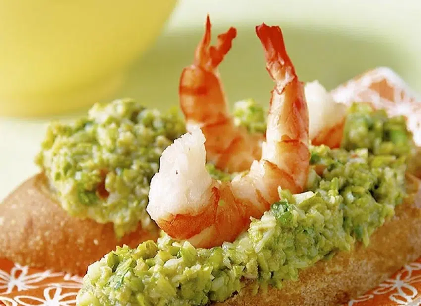 Bruschette au guacamole d'asperges vertes et crevettes tigrées