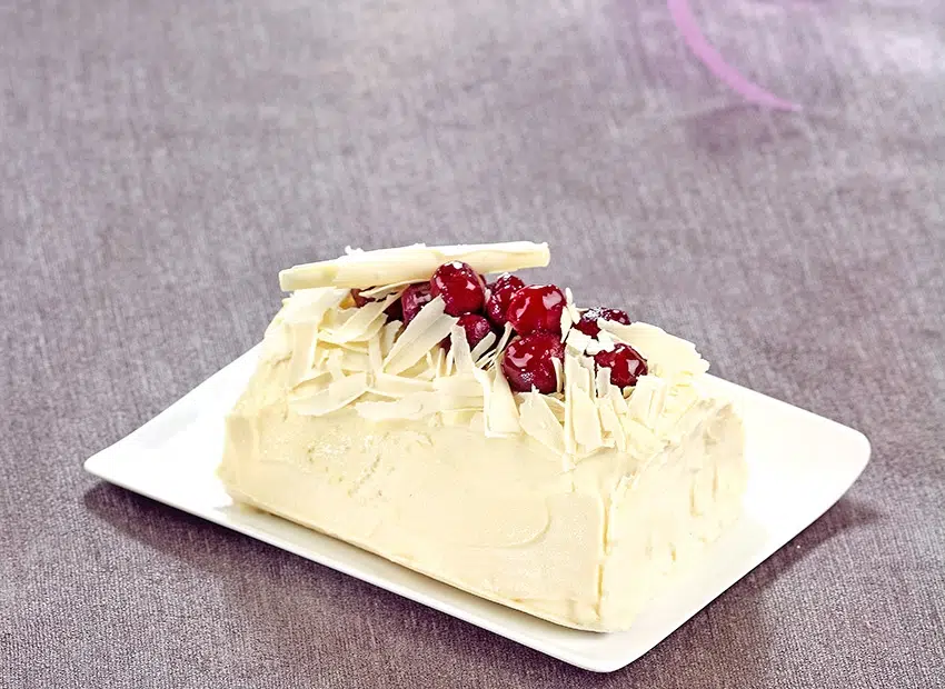 Avant de servir, disposez sur le dessus de la bûche, les cerises réservées ainsi que les copeaux de chocolat blanc.