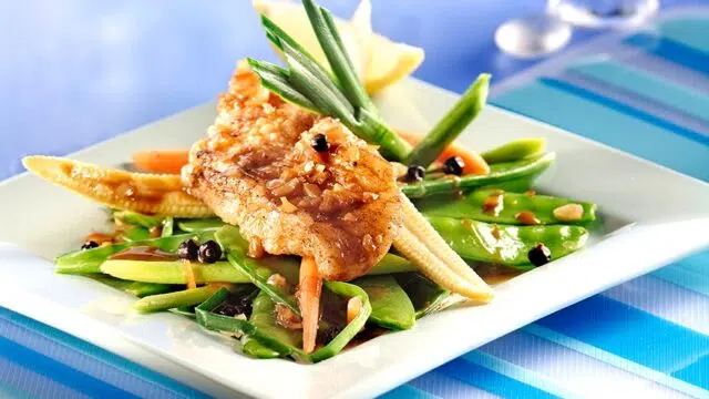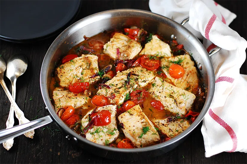 Saler et poivrer les morceaux de poisson sur les deux faces. Les déposer sur la plaque à côté des tomates et les recouvrir de la présentation avec la chapelure et les graines.
