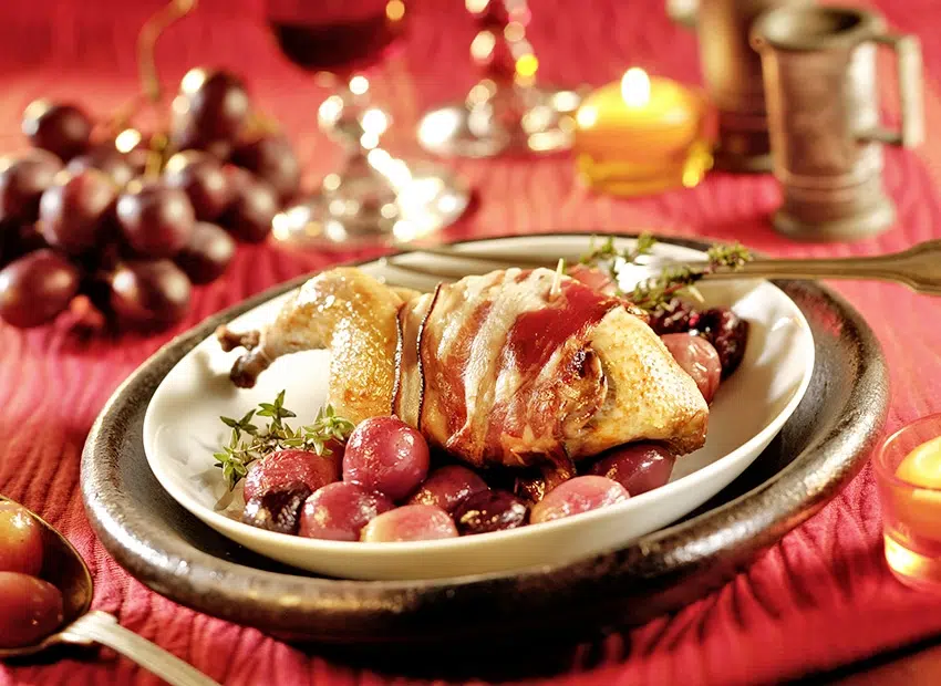 Dans une casserole, faites colorer les cailles bardées sur feu vif, dans le beurre et l’huile. Ajoutez les raisins lavés et égrainés.