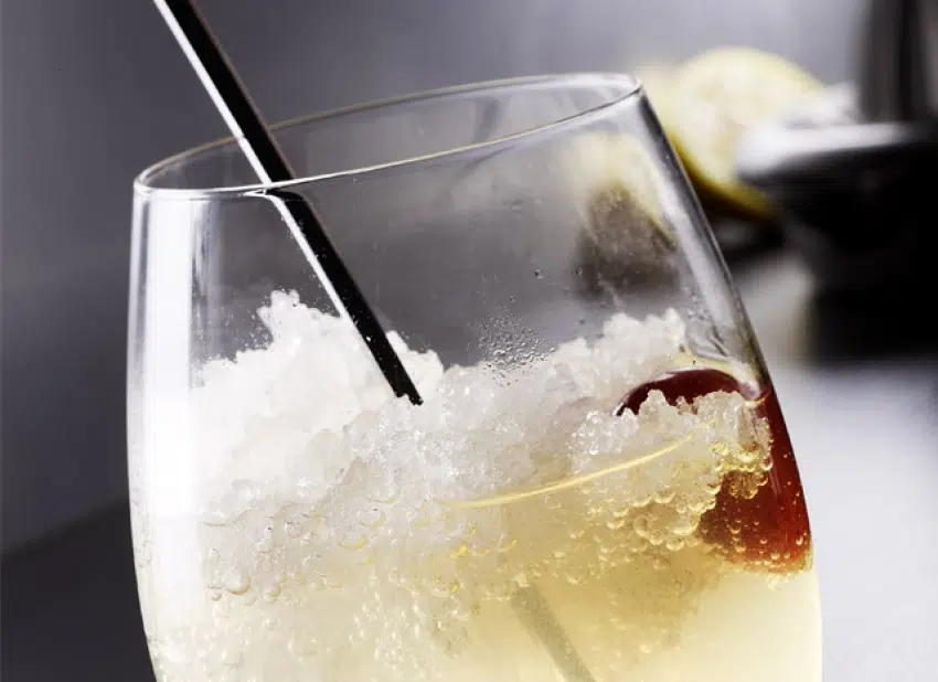 Ajoutez la glace pilée et complétez de champagne très frais.