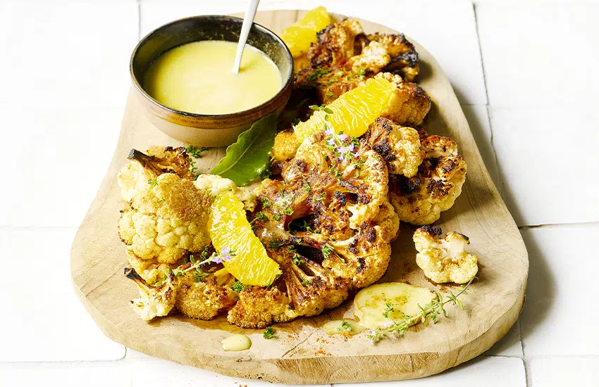 Pendant la cuisson du chou-fl eur, préparer la vinaigrette en pressant 4 mandarines en jus. Mélanger le jus avec la moutarde, l’huile d’olive, le gingembre râpé et le persil haché. Terminer la vinaigrette en y ajoutant les quartiers de la dernière mandarine.