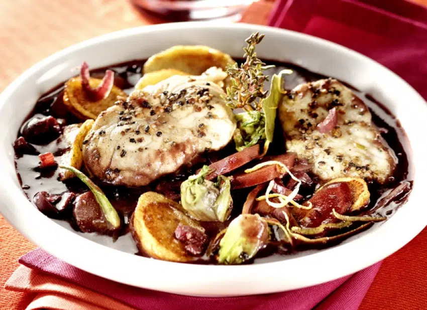 2. Ajoutez le vin rouge. Portez à ébullition et flambez pour éliminer l’alcool.