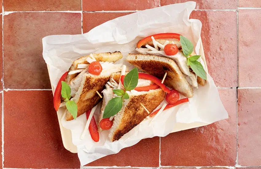 Couper les blancs de poulet en fines tranches. Saler, poivrer et griller.