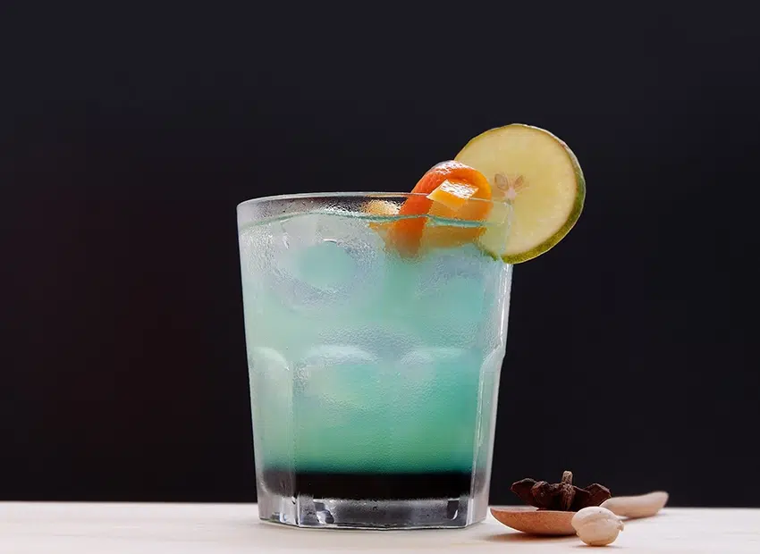 Quand vous versez le tonic, inclinez légèrement le verre pour libérer les bulles et leur permettre, ensuite, de mieux se mélanger au gin et curaçao.