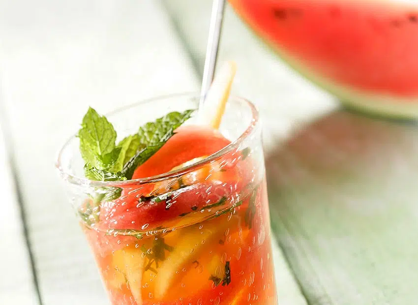 Ajoutez les morceaux découpés (lamelles, billes ou cubes) de melon et de pastèque, ainsi que la menthe ciselée. Réservez et servir bien frais.