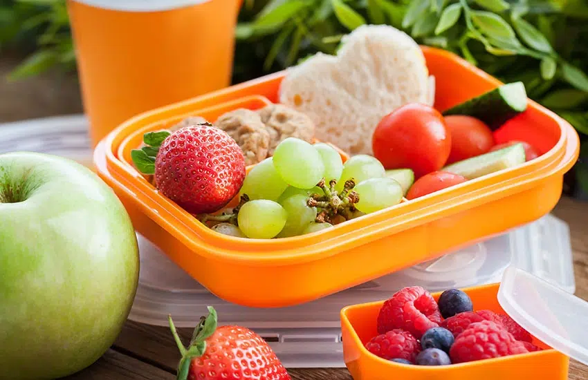 Compléter la boite à tartine avec des bâtonnets de concombre, des tomates cerise, des cookies et un fruit de saison.