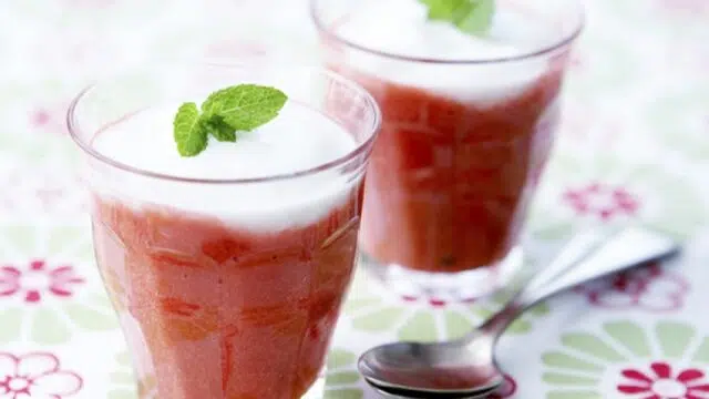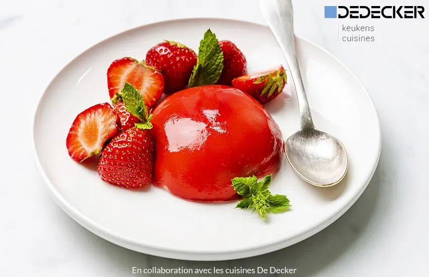 6. Faire chauffer le coulis de fraises et ajouter l’agar-agar, mixer afin d’éviter les morceaux.Verser sur les demi-sphères prises au congélateur.