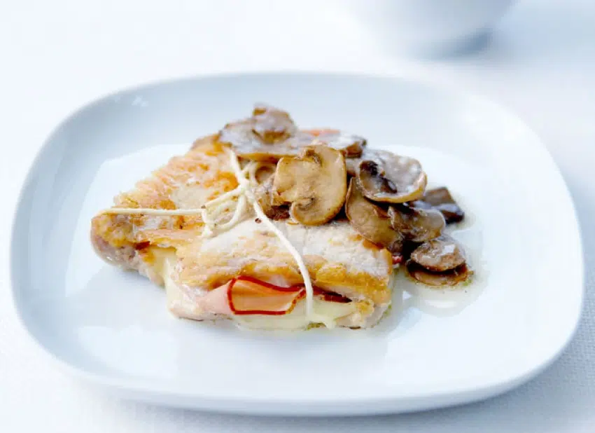 Faites une incision le long des côtes. Insérez le jambon d’Ardenne et le gruyère. Coupez 4 carrés de 20 cm de papier cuisson. Posez la viande sur les carrés. Répartissez les champignons. Arrosez de crème. Poivrez. Refermez les papillotes. Faites cuire 7 minutes au four.