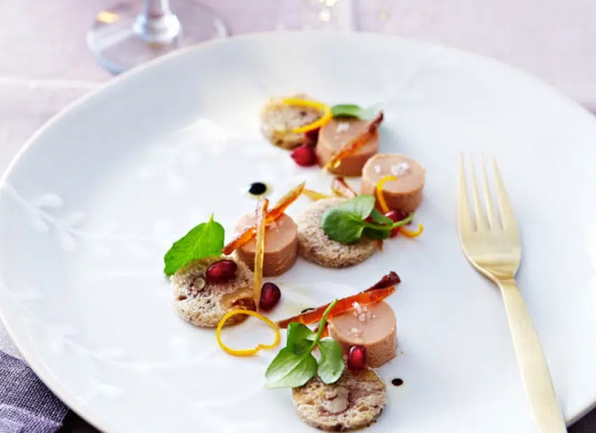 3. Disposez joliment le pain et le foie gras sur les assiettes avec les lamelles de dattes et d’orange. Saupoudrez d’un peu de fleur de sel. Décorez avec des feuilles de cresson de fontaine et des graines de grenade. Entourez de quelques gouttes d’huile d’olive et de vinaigre balsamique.