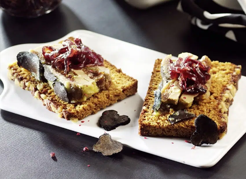 Foie gras, truffes et confiture d'oignons sur pain d'épices
