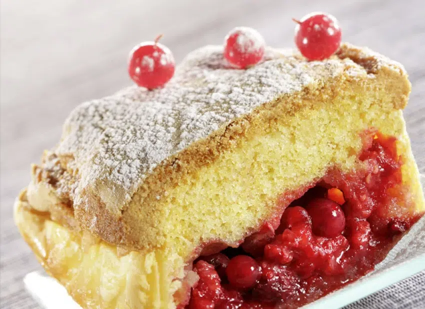 Mélangez les framboises, les fraises en morceaux, les groseilles égrainées et les 50g de sucre restant (gardez quelques groseilles pour la garniture). Garnissez le moule et complétez de pâte. Enfournez 30 minutes. Laissez refroidir.