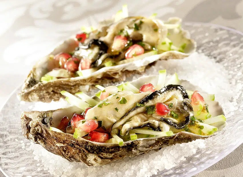 7. Hors feu, incorporez la sauce soja-citron, les graines de grenade et le persil ciselé. Nappez chaque huître avec ce beurre d’aromates et servez.