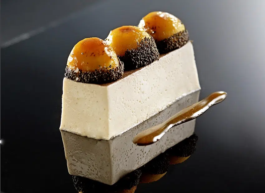 Sur chaque assiette, démoulez un lingot, décorez-le de 3 demi-billes de pommes au pavot et faites un trait de sauce au chocolat.