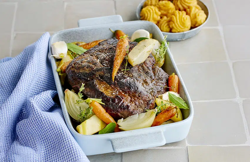Mijoté de bœuf, râgout de légumes anciens, pommes duchesses