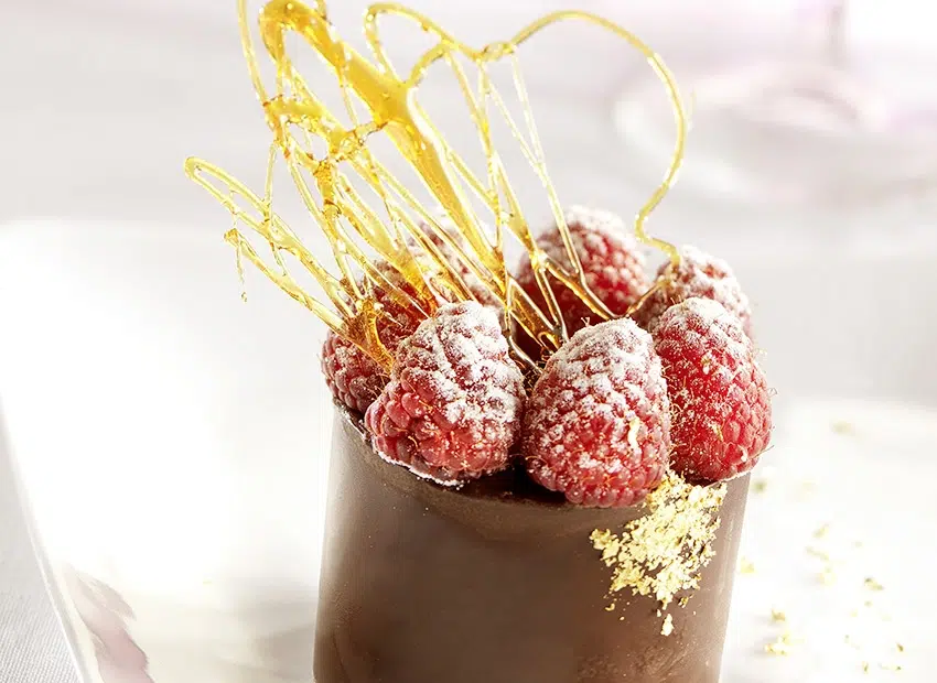 Pour faire briller les yeux de vos invités, décorez l’assiette de paillettes dorées ou de morceaux de feuilles d’or, tous deux alimentaires bien sûr.